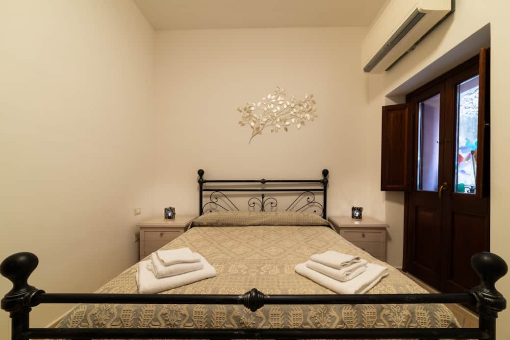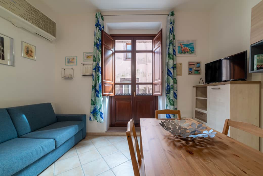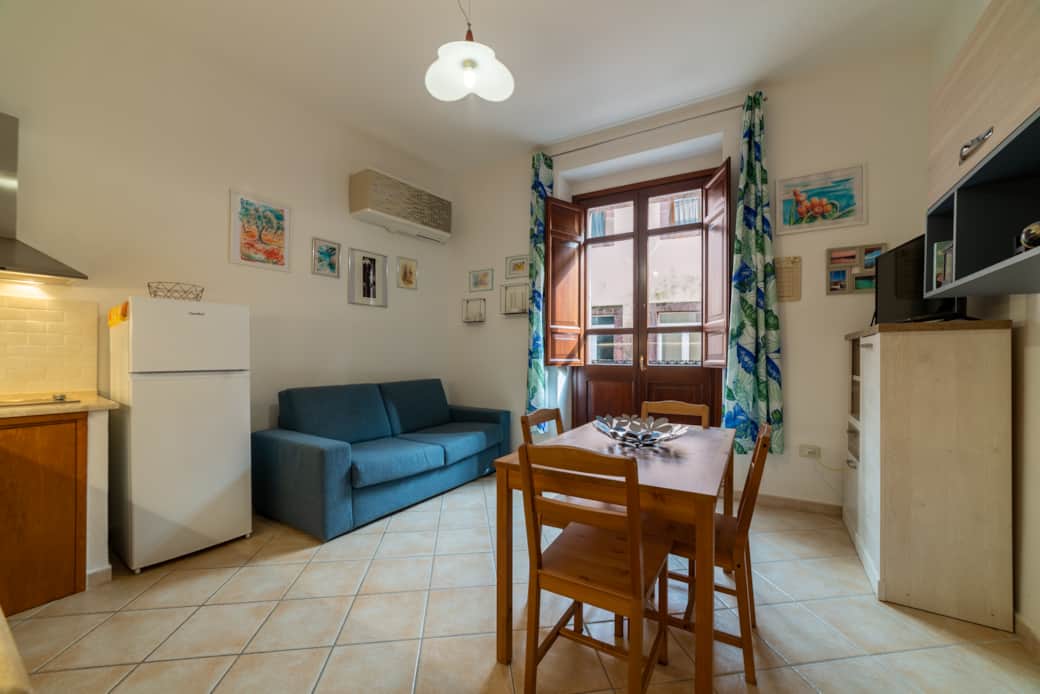 L’open space unisce soggiorno e cucina, con accesso a un balconcino affacciato sulla via principale, ideale per godersi il passeggio e l’atmosfera storica.