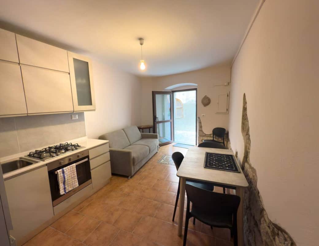 Si accede a una zona giorno accogliente, composta da una cucina moderna e un salottino raccolto.